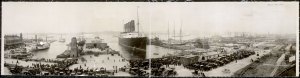 If you click on the photo and open it in a separate window, you’ll see there is an amazing amount of detail. This must have been a holiday of some kind, perhaps the 4th of July. There is a parade going on. There is bunting on some of the building. But you can also make out several ships, including a schooner sailing through the narrows on the right.