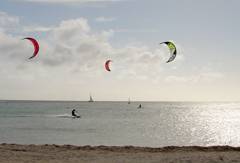 With the steady tradewinds blowing, Aruba is among the best places in the world to kite surf. When I first visited the island, wind surfing was all the rage. This is done with a board and a sail fixed to mast that is attached to the board. Kite surfing on the other hand is done with a kite that flies well above the surfer, who stands on the board with his feet in special loops. Here’s a photo taken near the Malmok area of Aruba.