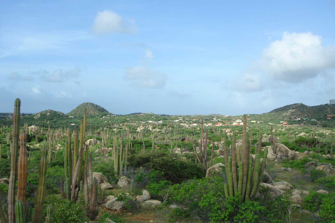 The desert landscape is looking green thanks to the rain that has been falling more frequently in the last few years. (And yet, this year things have been more dry.) At any rate, the tall cactus among the boulders make for striking contrast. Those boulders are granite, which you might not expect to find on a Caribbean island but the vagaries of the earth’s geography put them here. On the far right you’ll see a bit of a large water tank. Aruba’s water comes from a desalinization plant and is pumped to these tanks to maintain proper pressure in the lines. Works great and the water is pure and delicious.