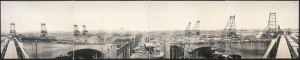 Of course the Battery, is just left of center. Beyond the Battery is the Statue of Liberty. Turning to the right, you’ll see Ellis Island. Between the Battery and the Statue of Liberty, note the tugboat steaming along, towing a barge just behind it. In the foreground you see terminals for ferries going to Coney Island and Staten Island. Then there is the warehouse-like structure for the Pennsylvania Railroad. The park leading up to the Battery looks immaculate, as do those carriages on the wide boulevard that fronts it.