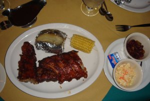 There’s plenty of meat on those bones. The baked potato is also a decent size. Cole slaw and beans come on the side as does a dish of the rib sauce for extra flavor. There were three of us at the table and we each gnawed off two racks of ribs, drank a couple gallons of water, and polished the sides to boot.