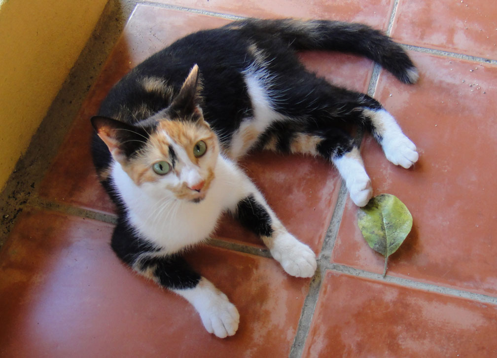 Snikkers ambled in one day and more or less comes and goes as she pleases. Of course, she’s a friendly calico who likes you to give her plenty of attention. Then, after a quick nap, she bolts after a lizard or some other unfortunate creature.