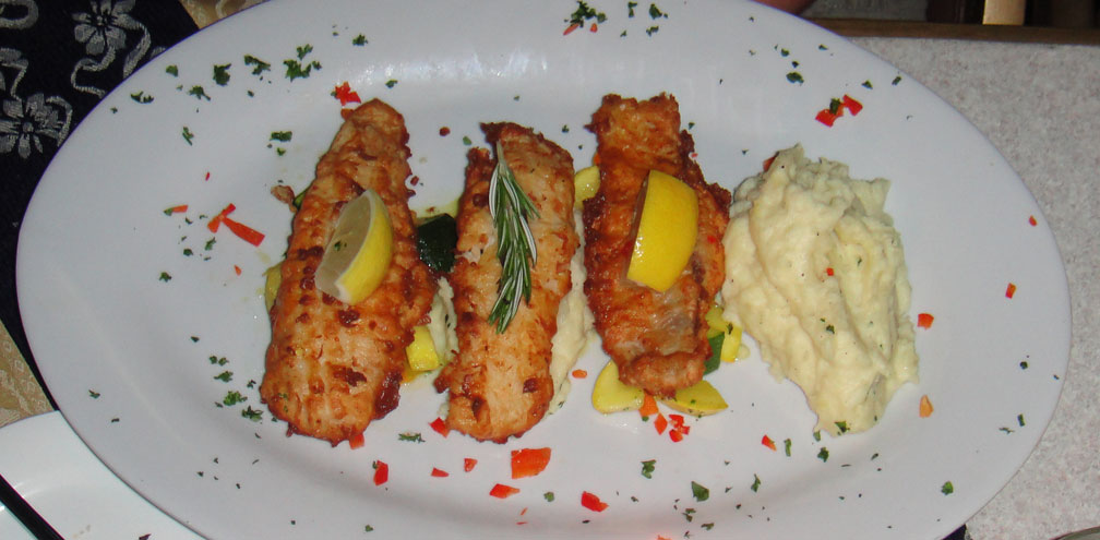 We enjoyed excellent conversation through these appetizers, not to mention a few glasses of wine and beer. Then came the entrees. Two of our group had fish, one was tilapia as seen below: