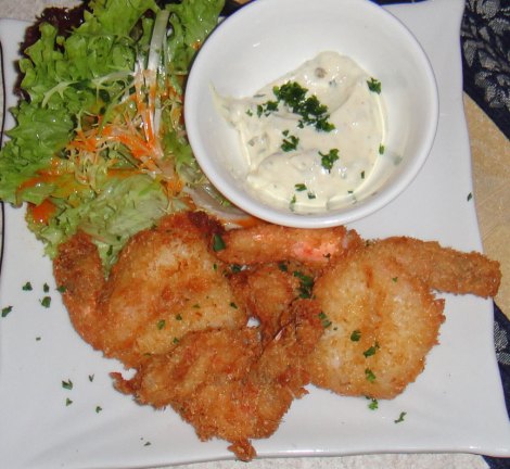 This is not my thing, however, both diners reported them to be very tasty and a different way of serving this delicacy. I opted for the tried and true coconut shrimp, which arrive with greens on the side as can be seen here: