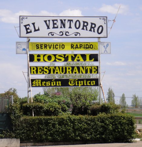 Well, not literally eating on the road, but rather making a stop at a joint just off the highway in Spain for a much needed meal. After all, I was hiking around castles and churches all morning and worked up a good appetite. (I’ve mentioned this a lot lately here on the Bent Page.) Rolling down the exit ramp, I spotted this sign: