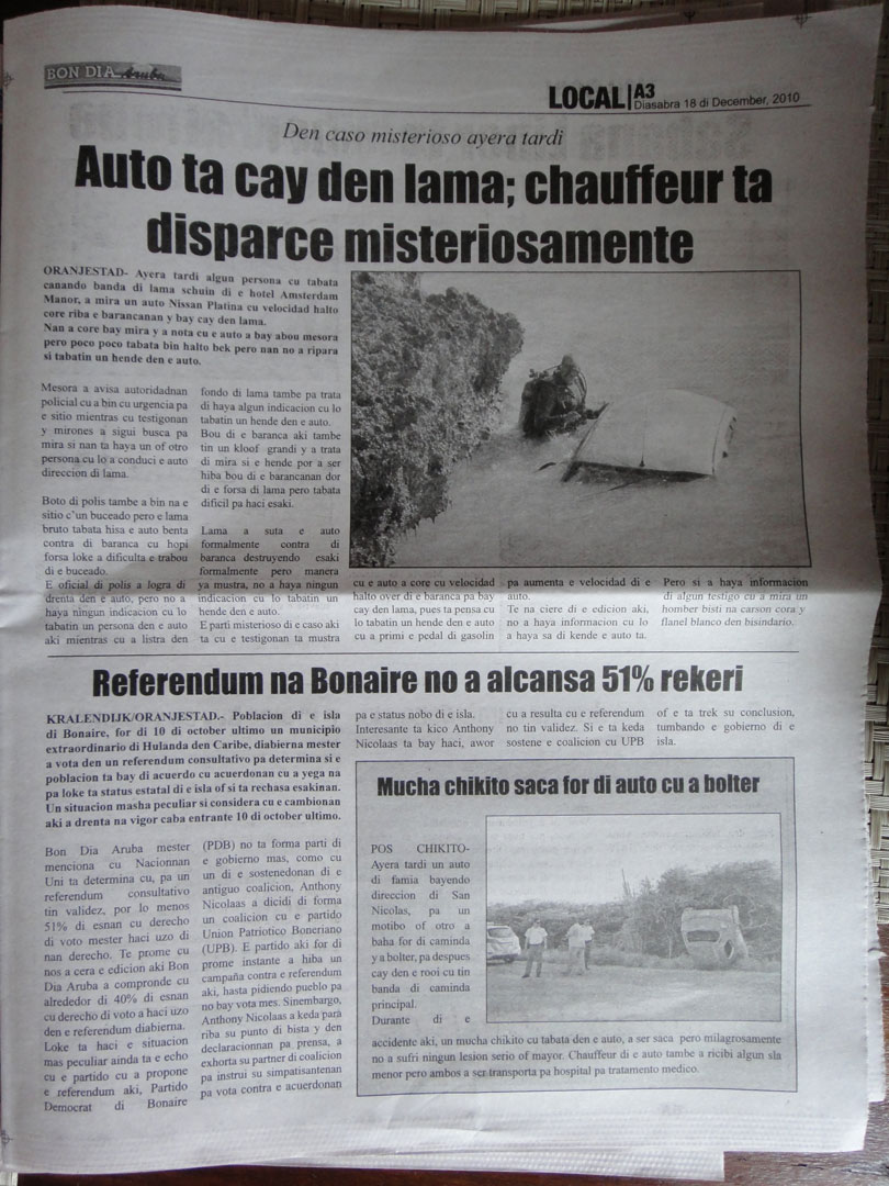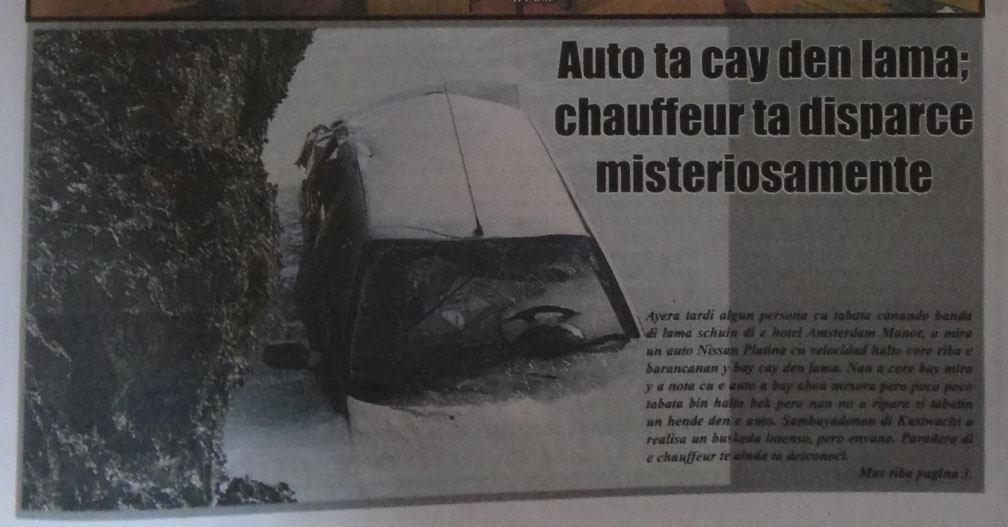 Driving in Aruba can be a contact sport. As they say in NASCAR, “Rubbing is racing,” or something like that. It was an exciting week for car crashes. A couple of rollovers and one into the ocean at Eagle Beach. Here’s a look from the local newspaper.