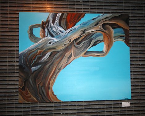 Aruba has the good fortune to have Joe Miklojcik in residence. Mr. Miklojcik is a visual artist and recently I had the pleasure of seeing his work on display at the Westin Hotel’s gallery space. All the works were oil on canvas for this show. Below is one of my favorites that evokes the many Divi trees found on the island.