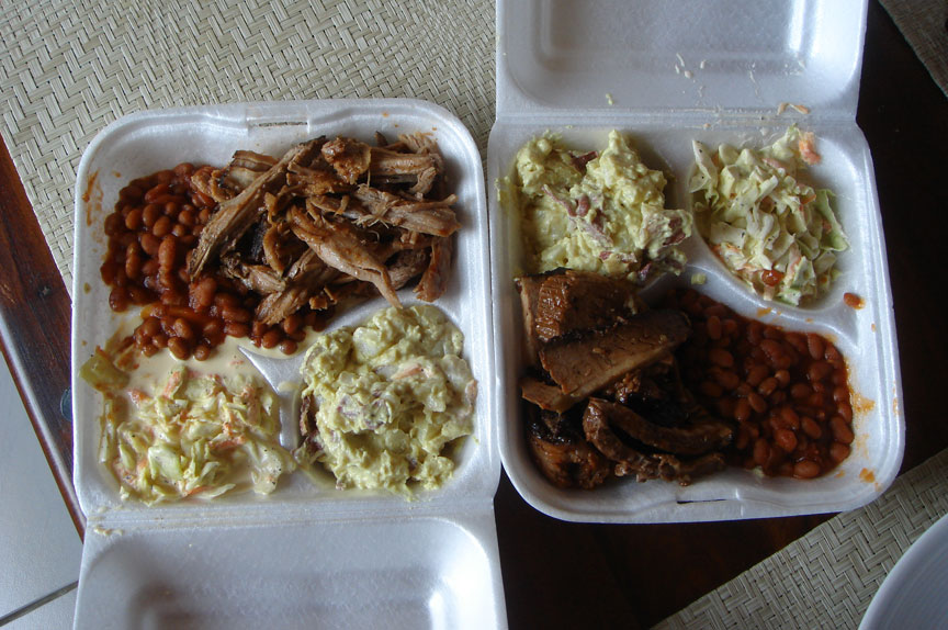 I opted to try two platters today, one pulled pork, the other beef brisket. Platters are served with cole slaw and a choice of sides. As you can see below, I opted for the potato salad and baked beans, both appropriate to the barbeque vibe. Feast your eyes upon this feast.