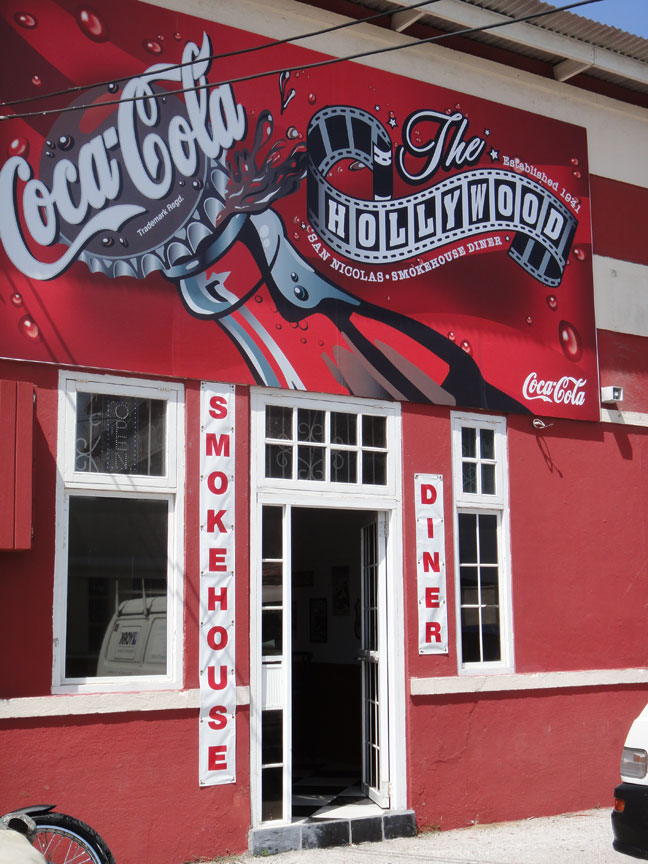 The Hollywood Smokehouse Diner is located in my favorite Aruba town, San Nicolaas, and the food is worth the drive. It’s easy to find, only 2 blocks from the Main Gate of the refinery. There’s plenty of parking in front. Thus, roll into town, go all the way to the end, and on the corner of Helfrichstraat you’ll find this place ready to serve up some Carolina-style pulled pork and Texas brisket that will impress hard-core barbeque lovers. Here’s a view of the outside. Love that Coca-Cola sign, too.