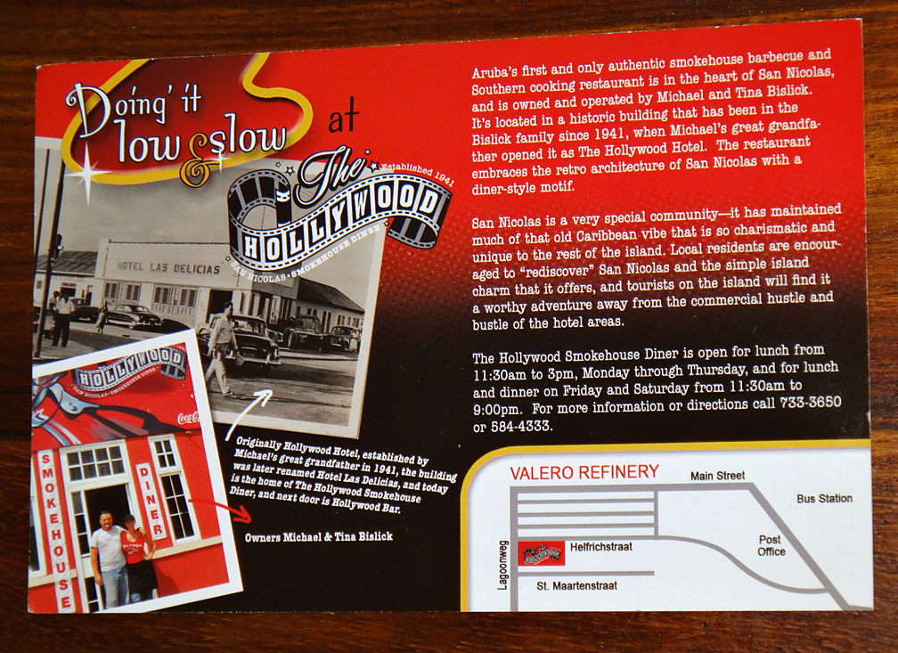 That’s a beef brisket platter with cole slaw, potato salad, and beans for the low price of afl. 22.00. (About $12 US) Fair enough and plenty filling. That brisket will cut with a fork so forget the knife. Plus, chatting with Mike and the other patrons enhances the experience if you eat in. On you way to or from Baby Beach or just rambling about the island, don’t miss the Hollywood Smokehouse and Diner. Most excellent and highly recommended. Here is a shot of the menu card.