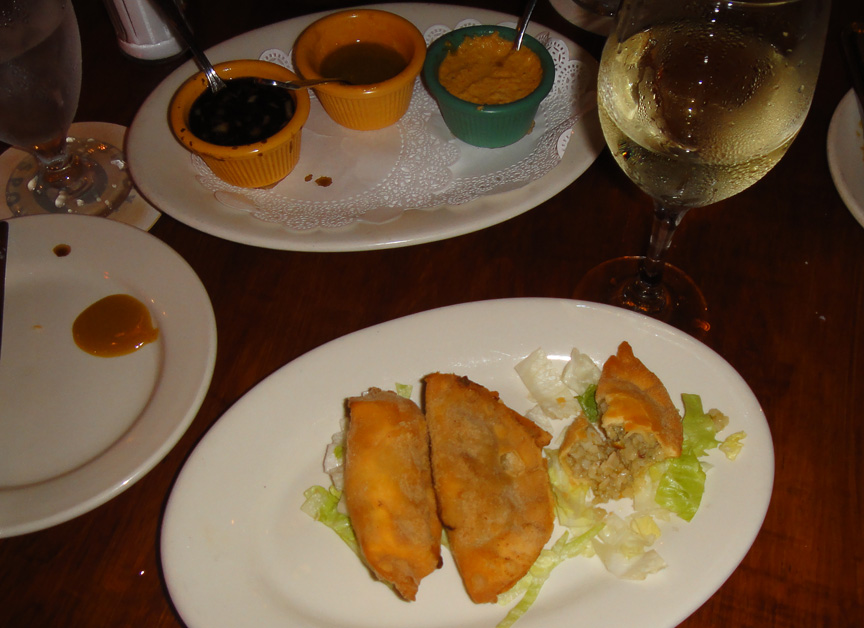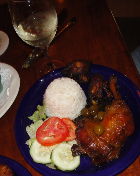 You’ll notice the three sauces served with the empanadas, each one a style for your varied tastes. Next came the entrees. Olive chicken as seen in this photo:
