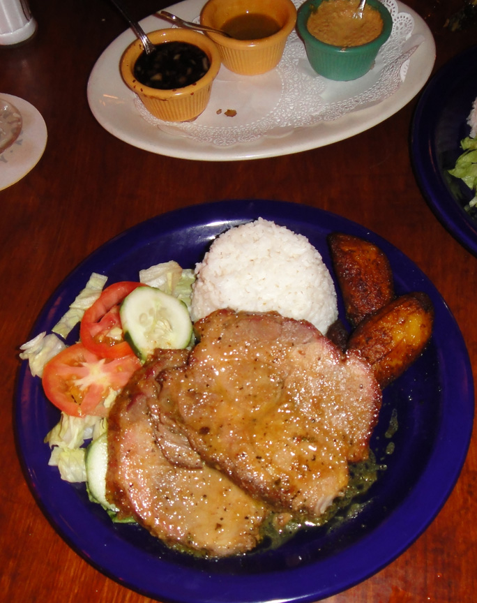 Also slow cooked to be cut with a fork. These main courses came with rice and fried plantains and a bit of salad on the side. What is an added benefit to this restaurant is the live music. During my visit there was a fellow on stage with a guitar and the lively crowd joined in to play the bongos, maracas, and sing along. Lots of fun. Here’s the stage and note the artwork on the surrounding walls.