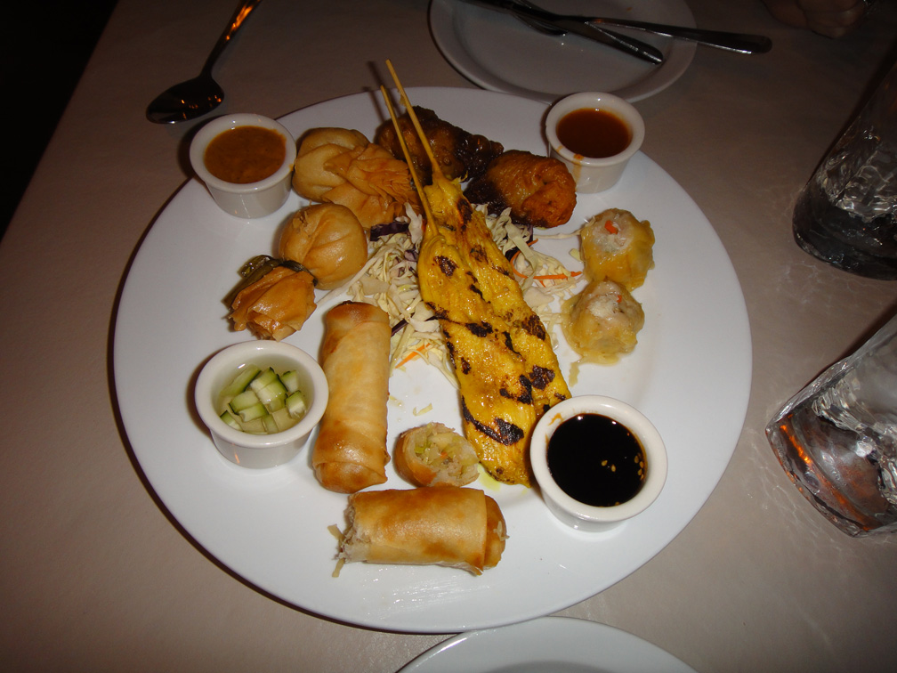 Thai food intrigues me. I know very little about this type of cuisine, but find myself willing to try it. So, recently I stopped in to La Na, located in Media, PA, USA, for a taste. It was quite delicious, with a mixture of flavors different from what I’m used to. Here goes. We started with the Thai Treasure appetizer, which is a typical dumpling and spring roll type of assortment. What made this more interesting was the sauce, there were four to choose from. Have a look:
