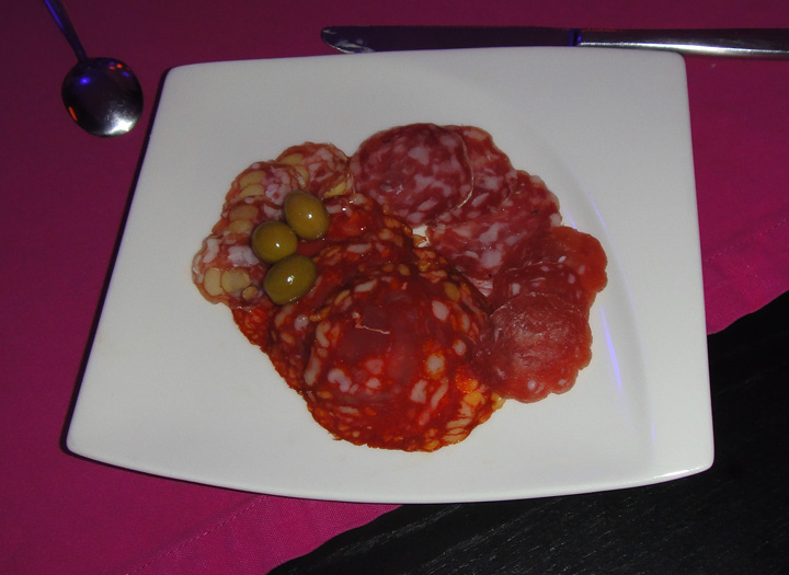 It was a great start, the right combination of tangy and hot. Next came plates of cured meats and cheeses, which gave me a flashback to Spain. Here’s the meats first.