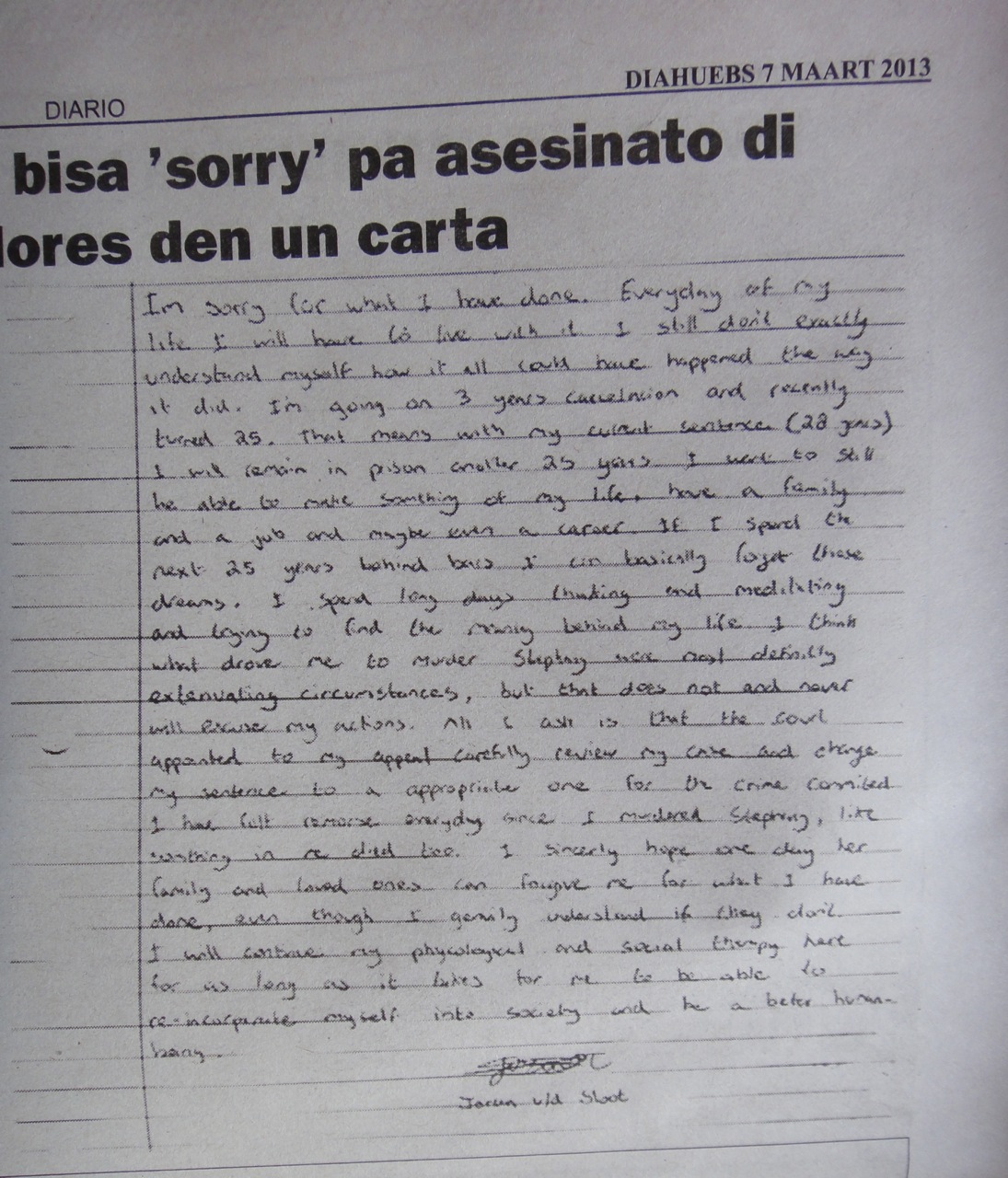 Below is a photograph of the letter Joran Van Der Sloot wrote, stating his sorry for murdering a young woman.
