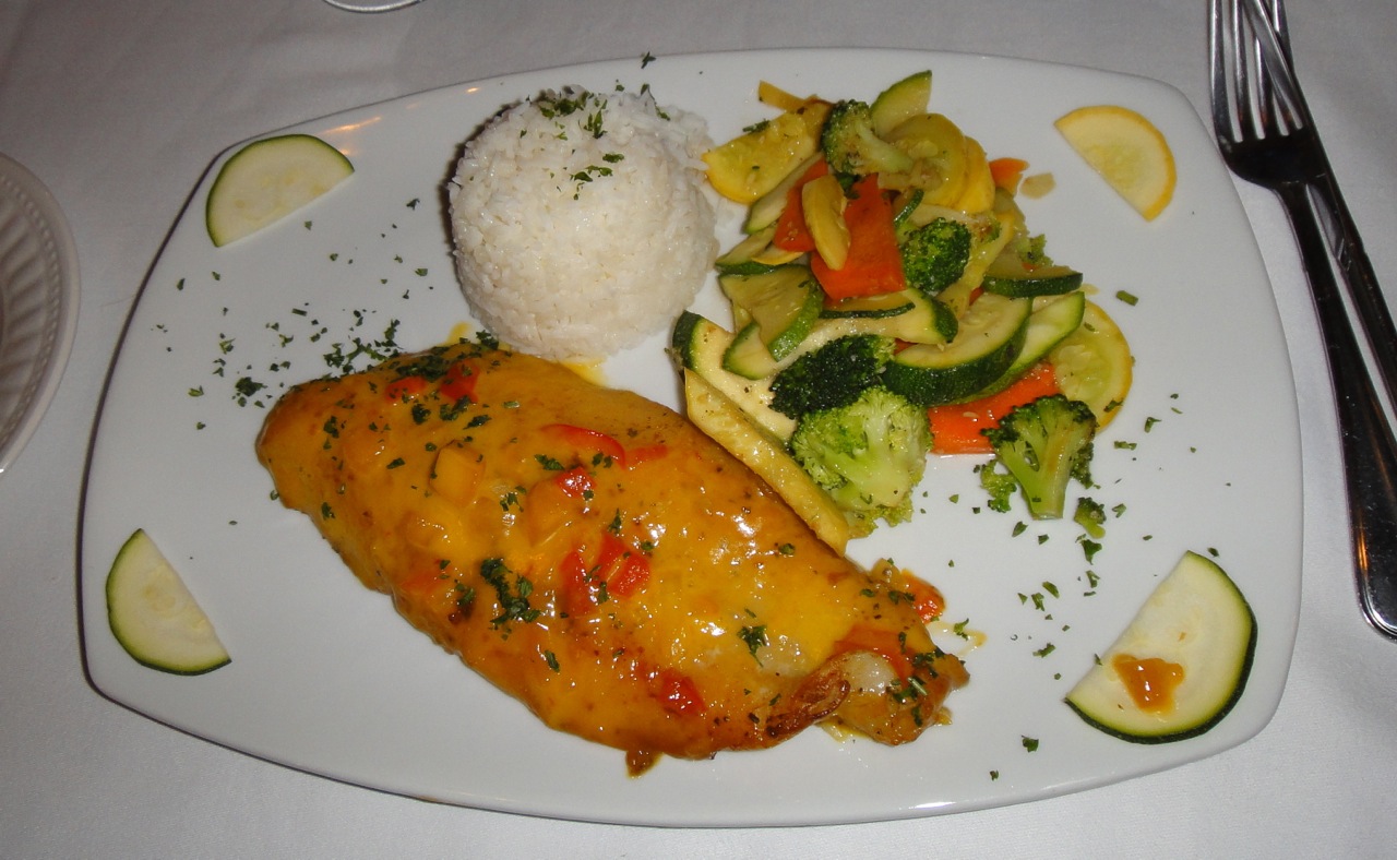 Those shrimp were quite large. There was also a nice caesar salad. But let’s see some entrees, like this grouper with mango sauce: