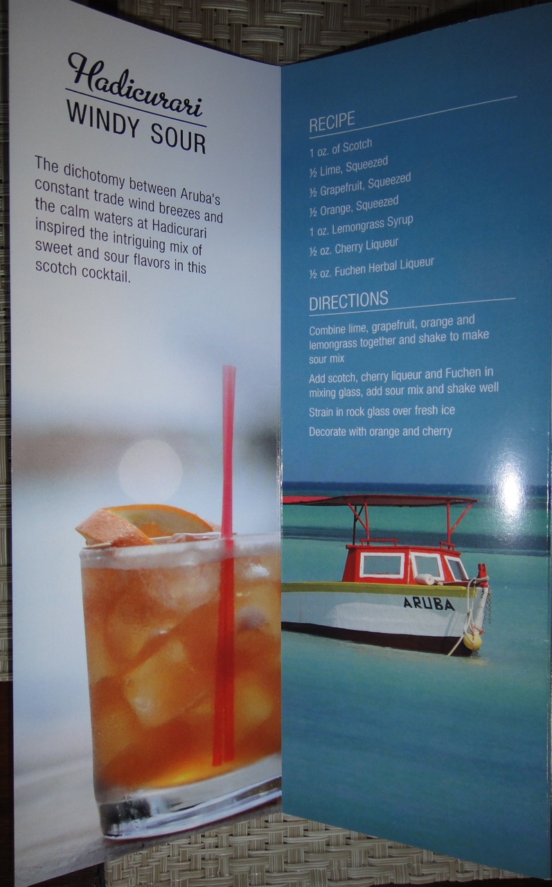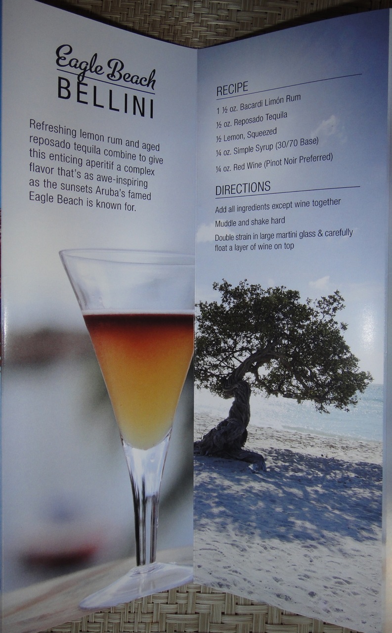 Although I like my adult beverages simple, I appreciate the creativity of a good bartender. Hence, while having a few drinks at White Modern Cuisine (one of Aruba’s best restaurants), the bartender provided me with a handsome brochure of some signature drinks he created, each one a play on words and favorite cocktails.