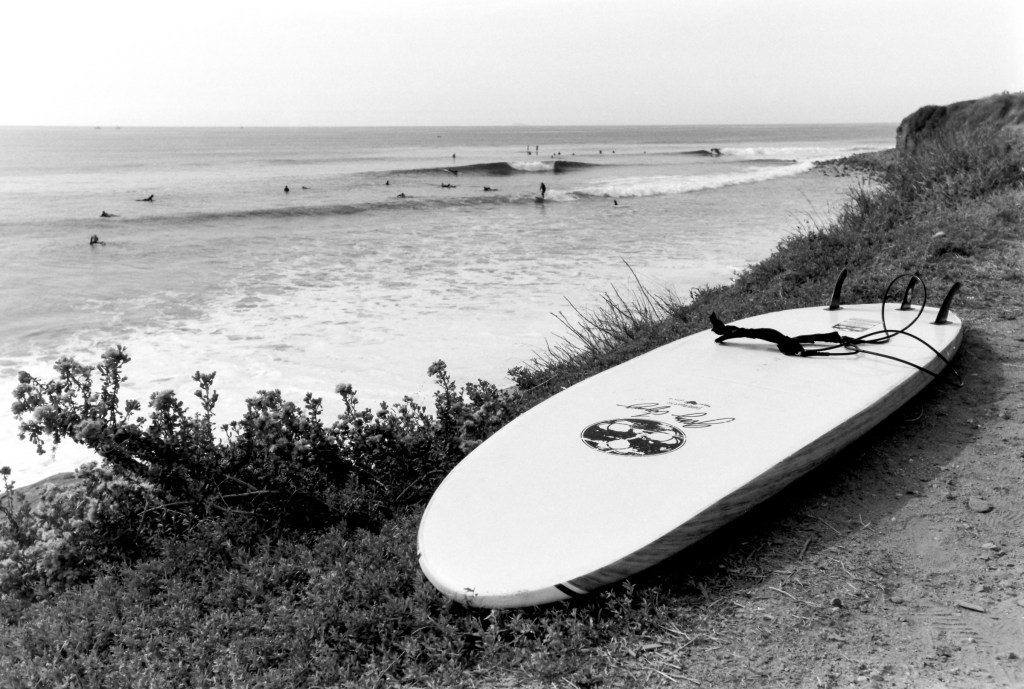 Surfboard at the top of the cliff at Ventura County Line, California, USA. Was a calm day. Still, surfers out there trying to get in some practice. Nikon F5, Nikkor 17-35mm 2.8D, Kodak TriX400.