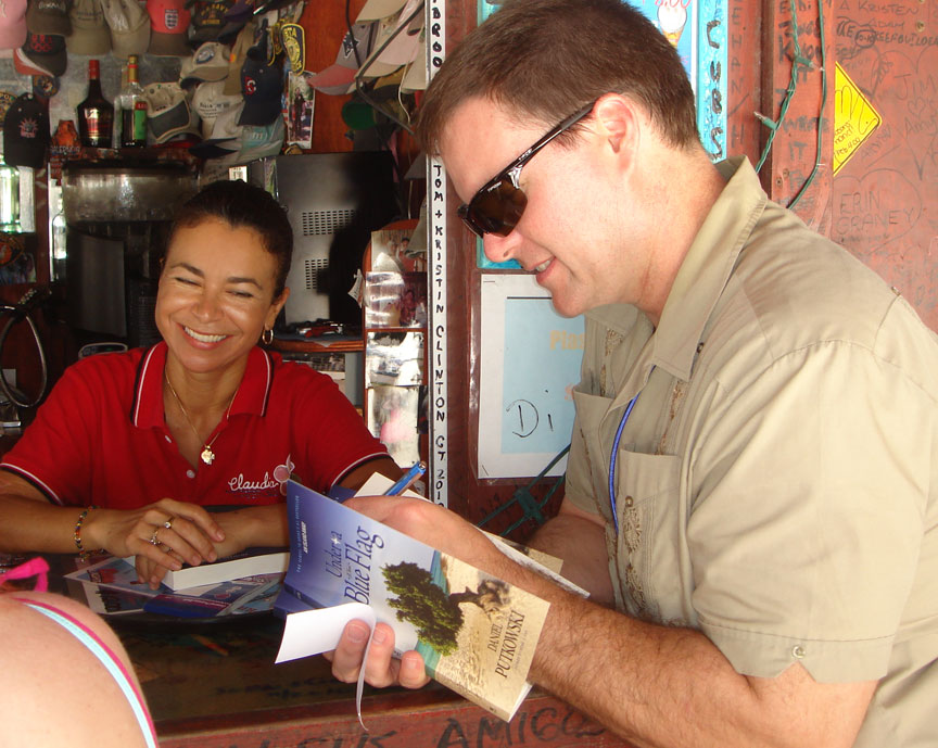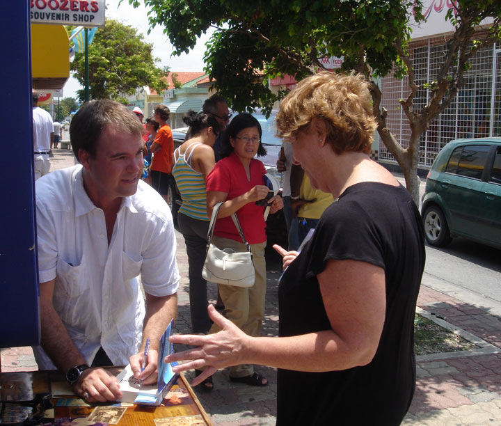 I’m signing on a table we put on Main Street so there would be room for more people in the bar. In the photo above is my friend from college and her mother. Like so many people who love Aruba, they visit the island at least once a year. Then there was this lady, who reminded me of a character from the book, but she insists it wasn’t her.