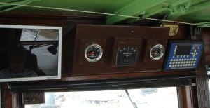 Above you’ll see the two throttles, one for each engine. The view from the wheelhouse is actually pretty good when looking forward. There are windows all the way around but plenty of blind spots to the stern. There is a stern steering station outside, but from there, of course, it is hard to see forward. You have to learn to anticipate your moves, judge how far something will move, and how fast it will move there. Anyway, push the throttle forward one notch to engage the wheels (propellers). Further than the first notch increases the speed of the propeller (not necessarily the boat). Steering is accomplished with a small lever. Sorry, no big, wooden ship’s wheel here. Above the windows is a panel that is shown below.