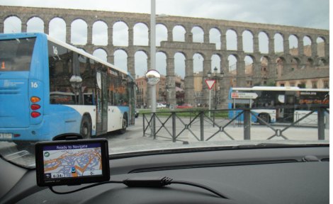 In the lower left corner of the photo you’ll see the tangle of streets that is Segovia. Directly ahead stands the Roman aqueduct. The software which provides guidance from point to point can make some unusual suggestions, sending you on less than optimal roads even though you select “fastest” or “highway” or a similar restriction. Still, it was better than paper maps in that it is constantly scrolling along with you as you drive. Not to mention that it is smaller and lighter.