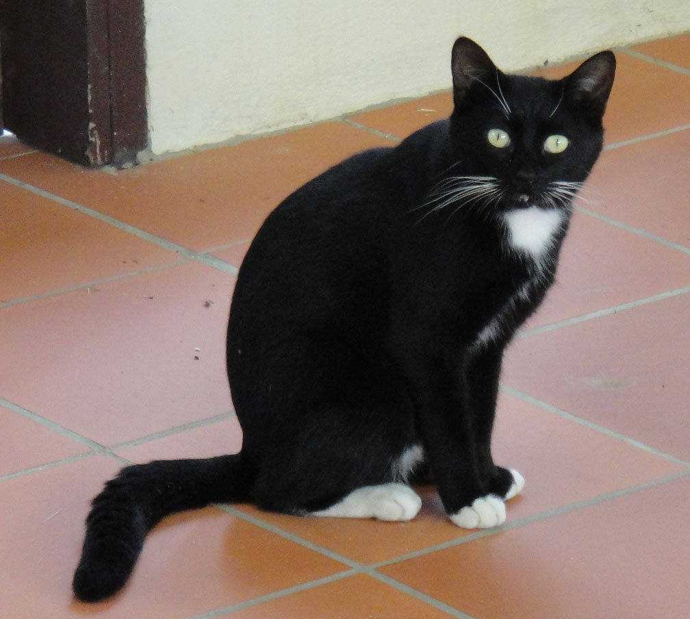Tuxer is a stray cat that shows up here at my shack in Aruba from time to time. He’s a regular visitor on an irregular schedule. He likes to take a nap on my patio, a drink from the water I put out for him, and an occasional snack, too. From the photo below, you can see how he got his name.