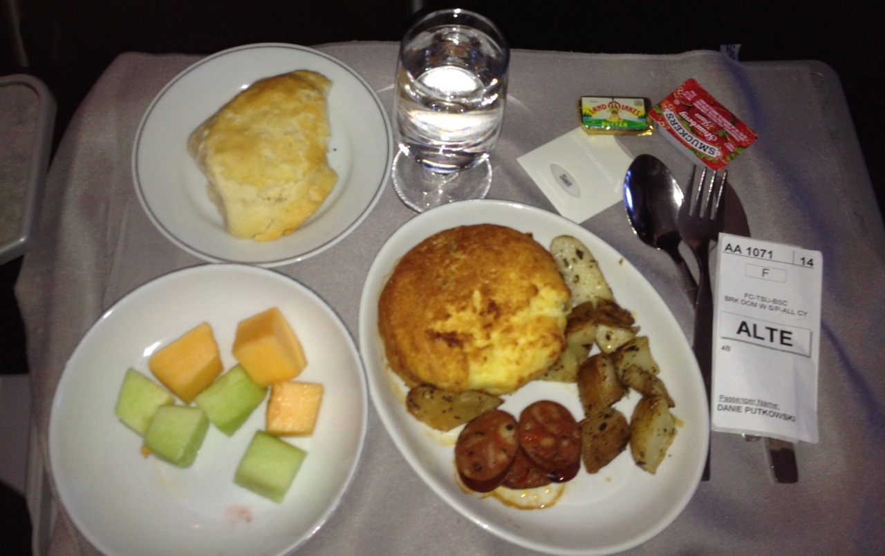 Several months ago, American Airlines sent me a pleasant email, declaring I could select my entree for the upcoming flight. What a pleasant surprise! Normally, you watch the stewardess roll the cart past your seat, hoping you’ll get your choice. Not a huge issue, but then again, customer satisfaction matters in a competitive industry. So, giving a passenger the opportunity to have his preference means happy days. Of course, there are only two choices, which is fine with me. After all, we’re on an airplane, not in a swanky restaurant. On recent flights, I went with the egg option for breakfast that you see in the next photo: