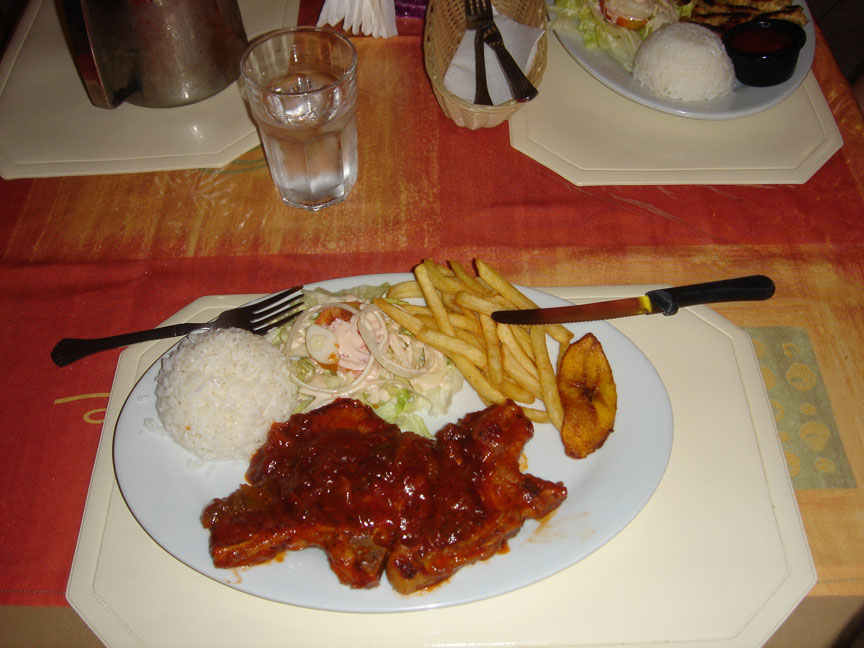 The owners clean this place like fanatics. (Sometimes there’s the heavy scent of cleaning fluids in the air but don’t let that put you off.) Anyway, on to the food. I like the pork chops in salsa criollo as shown below.