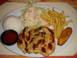 This platter contains two thin pork chops that are first grilled then smothered in the criollo sauce. The sauce is tangy sweet, and beyond that, hard to describe other than that it is good. You also get the rice, fries, salad, and fried plantain for the same low price. My wife likes the grilled chicken platter, that is shown here.