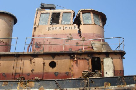 That gash in the wheelhouse above was probably caused by one the cables strung under the tug by the salvage crew. It’s a shame for these old boats. They’re big and clumsy compared to their modern counterparts. However, they have proud lines and a long history. Trouble is, they’re obsolete.