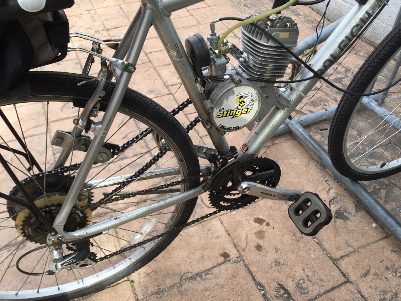 I spotted this bicycle during my recent travels. As you can see, it has two power system, the pedals and a small engine:
