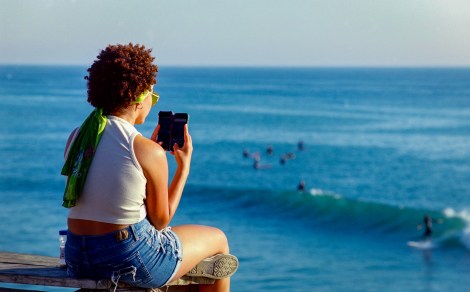 At Ventura County Line, California, USA, a young woman uses two phones to record the surfers below.