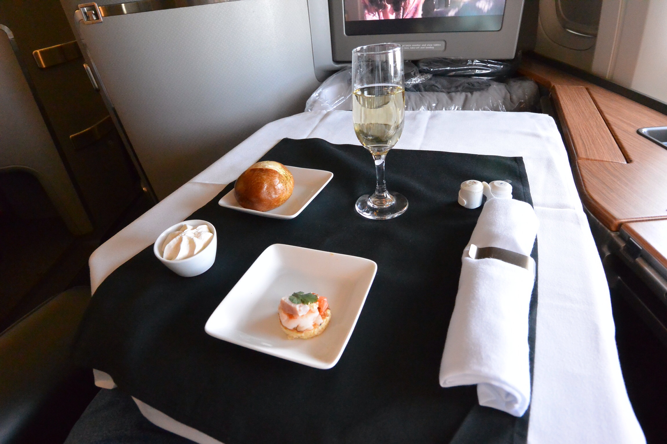 Naturally, snacks were on offer, including cooked meals from a menu as well as sandwiches and beverages from the “trolley.” I went with the sandwiches, which were egg and/or salmon. Both were quite tasty and served with a smile.