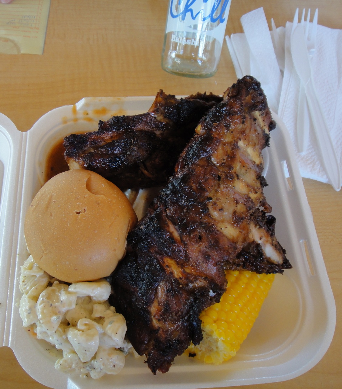 There are ribs and chicken on there, among other things. These are grilled meats, not low and slow roasted like you might expect. Bring your teeth and plan on chewing. So, here’s the ribs and chicken platter that includes corn on the cob, dinner roll, macaroni salad, and baked beans.