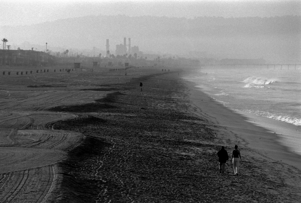 Walking south on Manhattan Beach, California, USA. Nikon F5, Nikkor 80-200mm 2.8D, Kodak TriX400.