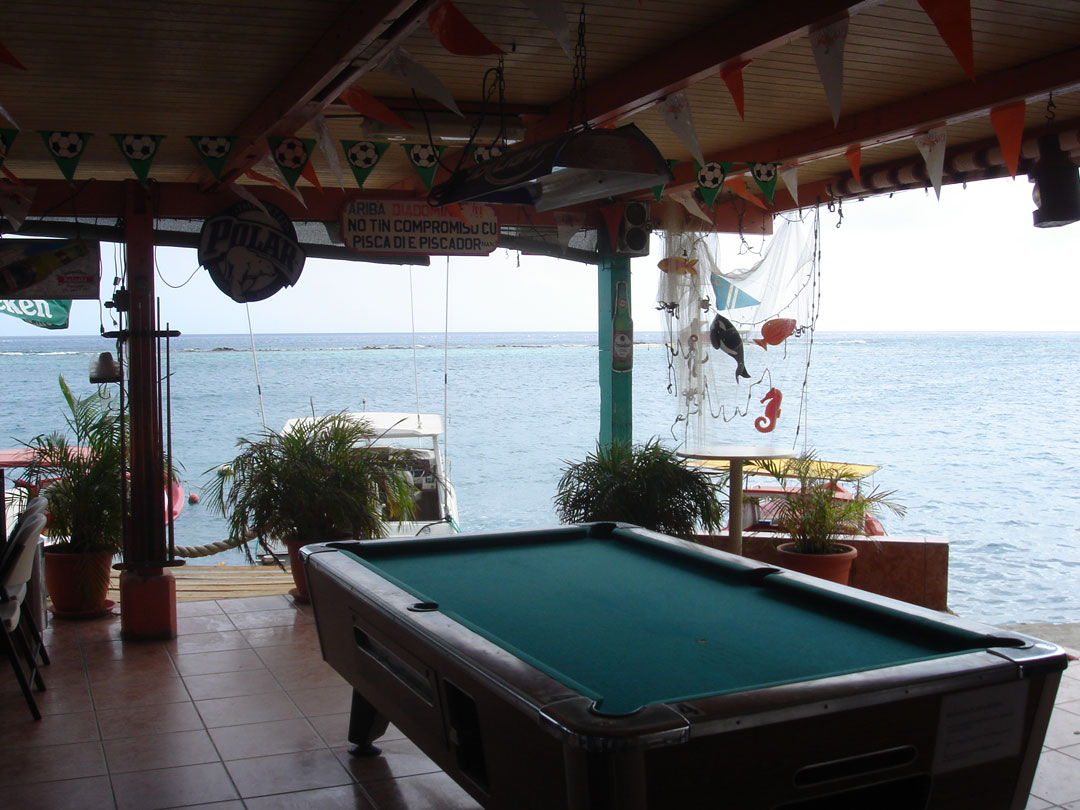 In the town of Savaneta on the island of Aruba, you’ll find a place called Zeerovers. In Dutch, Zeerovers means pirates. However, this place is more of a fisherman’s hangout than a pirate’s nest. Best of all, you can shoot a game of pool on this table, with that view. (Click to enlarge.)