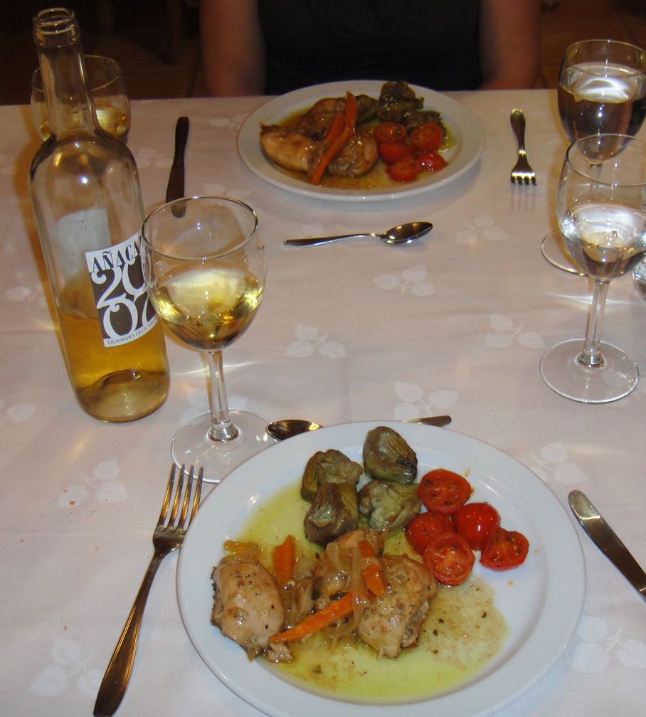 As long as we’re talking about Biar and mentioning Casa Rural Mas Fontanelles, let’s stay in this locale for the topic of home cooking. You see, we arrived at this place on a Monday, the normal day off for the staff. Similarly, we were the only ones staying at the Casa. Therefore, the owner made us supper in much the fashion he might have for his own family. Naturally, we started with a nice bottle of wine.