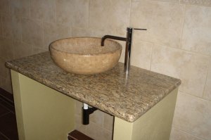 In the middle of the room, I built a sink feature from the ground up. The basin and faucet came from BanjoLux; the granite slab came from Acero, another great store here in Aruba. Acero will cut and drill the granite to your specs. As long as you order by Tuesday afternoon, it’s usually ready by Saturday at noon. So, here’s a look at that sink.