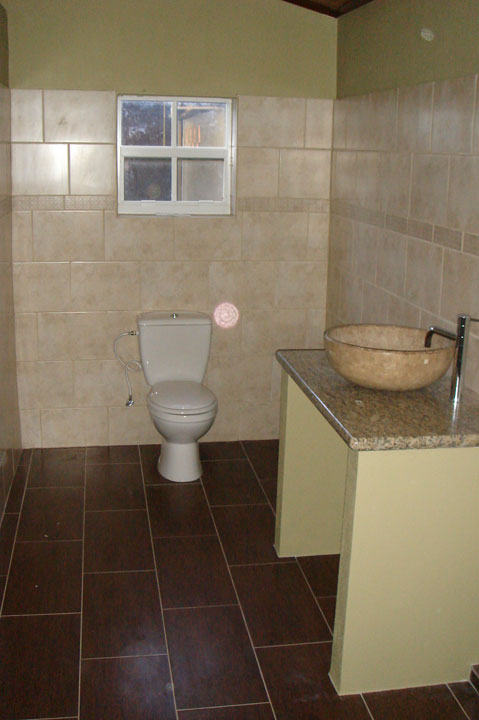 I had to install a temporary plastic drain beneath the basin until I get a chrome one cut to order. No big deal. It works fine. I’ll install a pair of wooden doors beneath the granite, too. On the far wall, closest to the final drain to the septic, sits the toilet as shown here.
