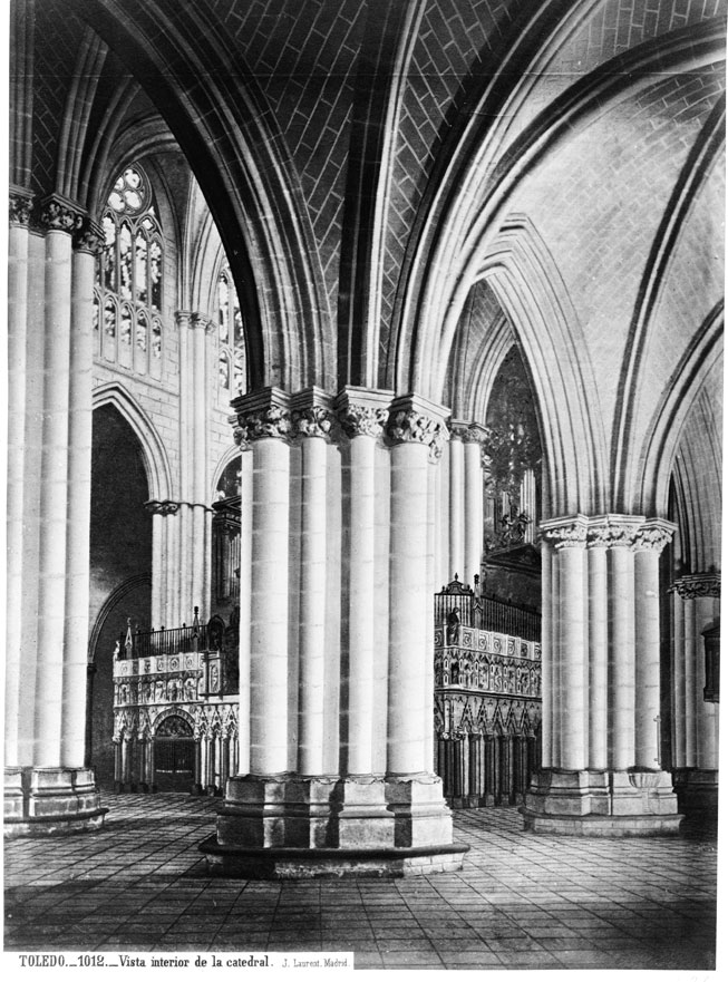 This old photo illustrates the “mudejar” arch, which was built by the Moors who controlled Spain for a time. After the unification of Spain by Ferdinand and Isabel, the mosque in Cordoba became a cathedral. Nonetheless, much of the original structure remained. In fact, when visiting the Mezquita, you’ll see that it appears as if a cathedral was inserted into the mosque. These arches stretch out in all directions giving an infinite feel to the space. On the other hand, if you travel to Toledo’s cathedral, you’ll see an example of high gothic construction like this: